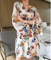 レトロ風 セーター ワンピース ミニ 長袖 ボリューム袖 ワイド Vネック カシュクール 襟なし Aライン 薄手 大人可愛い きれいめ お洒落 レトロ エキゾチック ラブリー セクシー 主役級 存在感 花柄 フラワー 夏 20代 30代 レディース 女性用 ママ デート お出かけ イベント リゾート 旅行 海 韓国系 オルチャン スタイル モテ ギフト 新作 サイズ S M