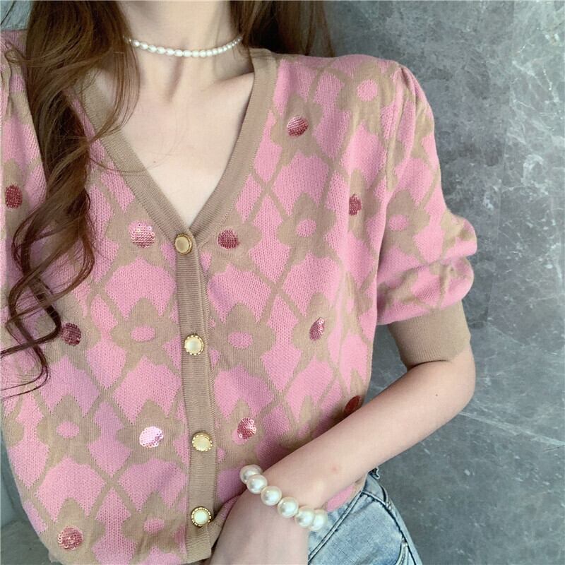 ニットカーディガン トップス カーディガン ショート ショート丈 半袖 Vネック 前開き ニット かわいい 大人可愛い カジュアル 上品 おしゃれ お洒落 レトロ 大人可愛い 大人女子 ラブリー ガーリー ルーズ 柄 花柄 フラワー 春 夏 秋 10代 20代 30代 レディース 通勤 学生 通学 デート お出かけ 女子会 休日 パーティー イベント リゾート 旅行 普段使い ファッション コーデ スタイル モテ ワンサイズ ピンク