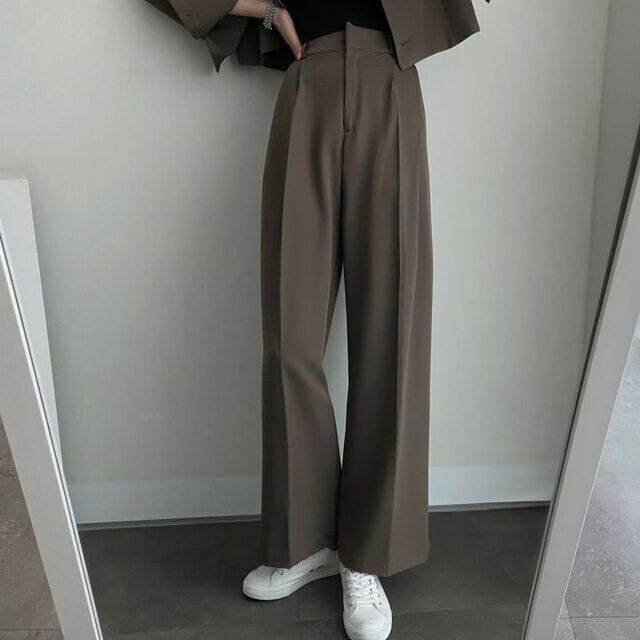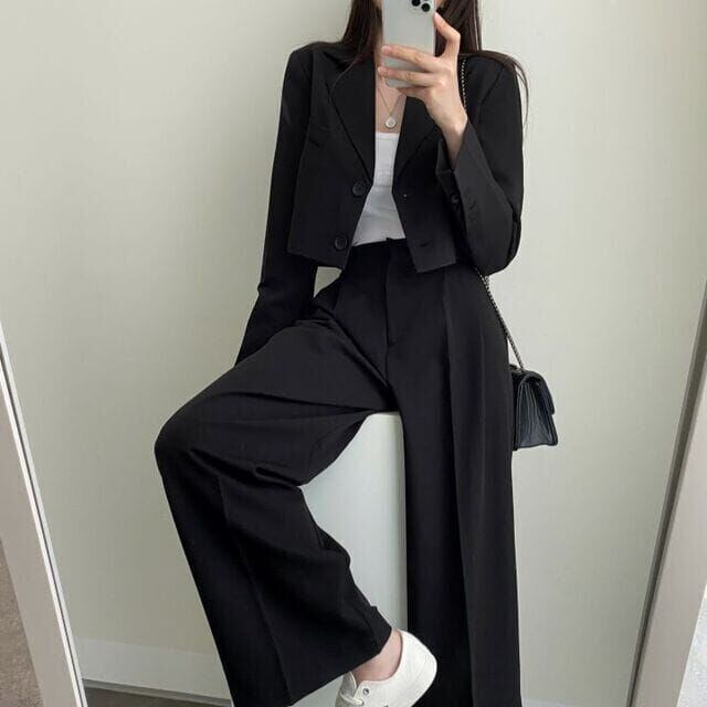 ショート丈のジャケットとワイドパンツのセットアップ。