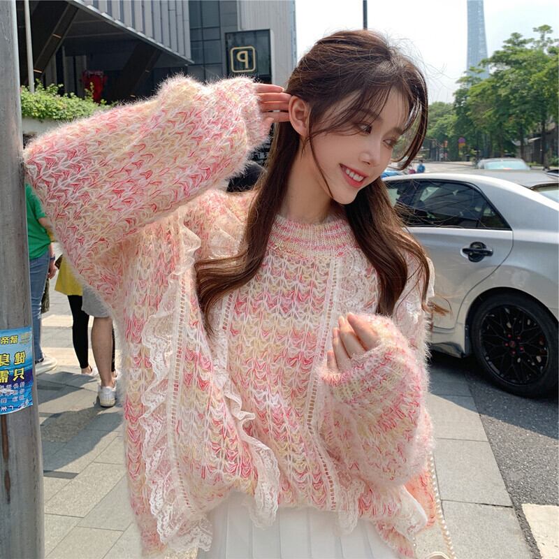 トップス セーター ニット 袖あり 長袖 ラウンドネック 襟なし レース モヘア かわいい おしゃれ お洒落 ラブリー キュート ガーリー ふわふわ もこもこ モコモコ ルーズ 主役級 存在感 S M L XL 2XL 3XL 4XL 大きいサイズ ゆったり ゆる ピンク ブルー 青 紫 パープル パステルカラー ニュアンスカラー 冬 10代 20代 30代 ママ 学生 通学 デート お出かけ 女子会 休日 旅行 普段使い お揃い 双子 韓国 オルチャン 体型カバー モテ