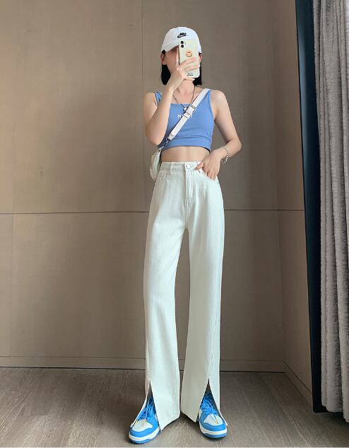ボトムス パンツ Gパン デニムパンツ ストレート ワイド スリット ハイウエスト デニム きれいめ シンプル カジュアル かっこいい 大人女子 こなれ感 ラフ マニッシュ スポーティー ストリート 無地 春 夏 秋 10代 20代 30代 40代 レディース 女性用 ママ 女の子 学生 通学 公園デビュー お泊まり 休日 散歩 BBQ 着回し 普段使い 楽ちん 体系カバー 脚長 合わせやすい ワイドレッグ サイズ XS S M L XL 2XL 白 ライトブルー