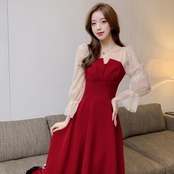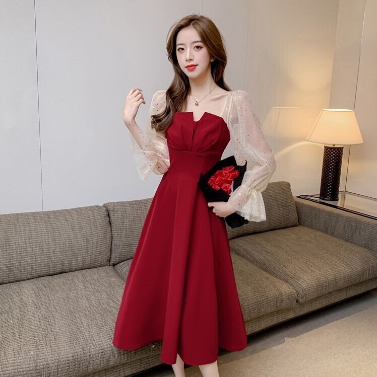 ドレススカート スカート ドレス ミドル丈 長袖 スクエアネック スリム 細身 Aライン ミドルウエスト メッシュ生地 大人可愛い きれいめ 大人 上品 大人女子 クール セクシー エレガント 秋 誕生日 結婚式 二次会 お呼ばれ 20代 30代 レディース 女性用 デート 女子会 パーティー イベント ホテル レストラン ファッション コーデ スタイル S M L XL 2XL 赤 レッド