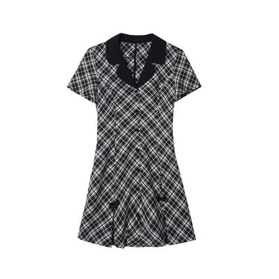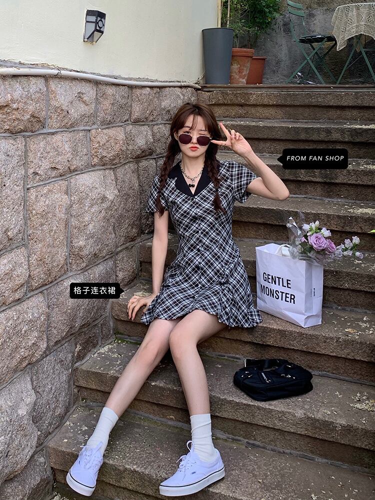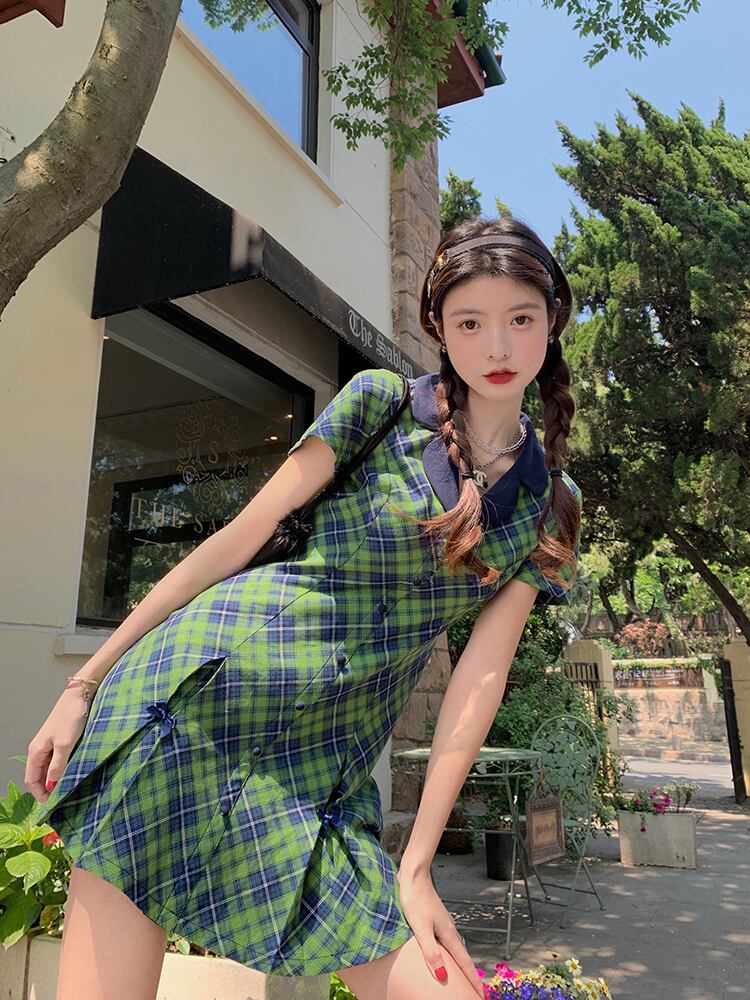 ワンピース ミニ丈 半袖 襟付き かわいい カジュアル お洒落 レトロ ラブリー キュート ガーリー 花柄 小花柄 チェック柄 春 秋 10代 20代 レディース 女性用 学生 通学 デート お出かけ 女子会 休日 イベント 旅行 高原 ホテル レストラン ファッション コーデ スタイル モテ S M L ブラック グリーン