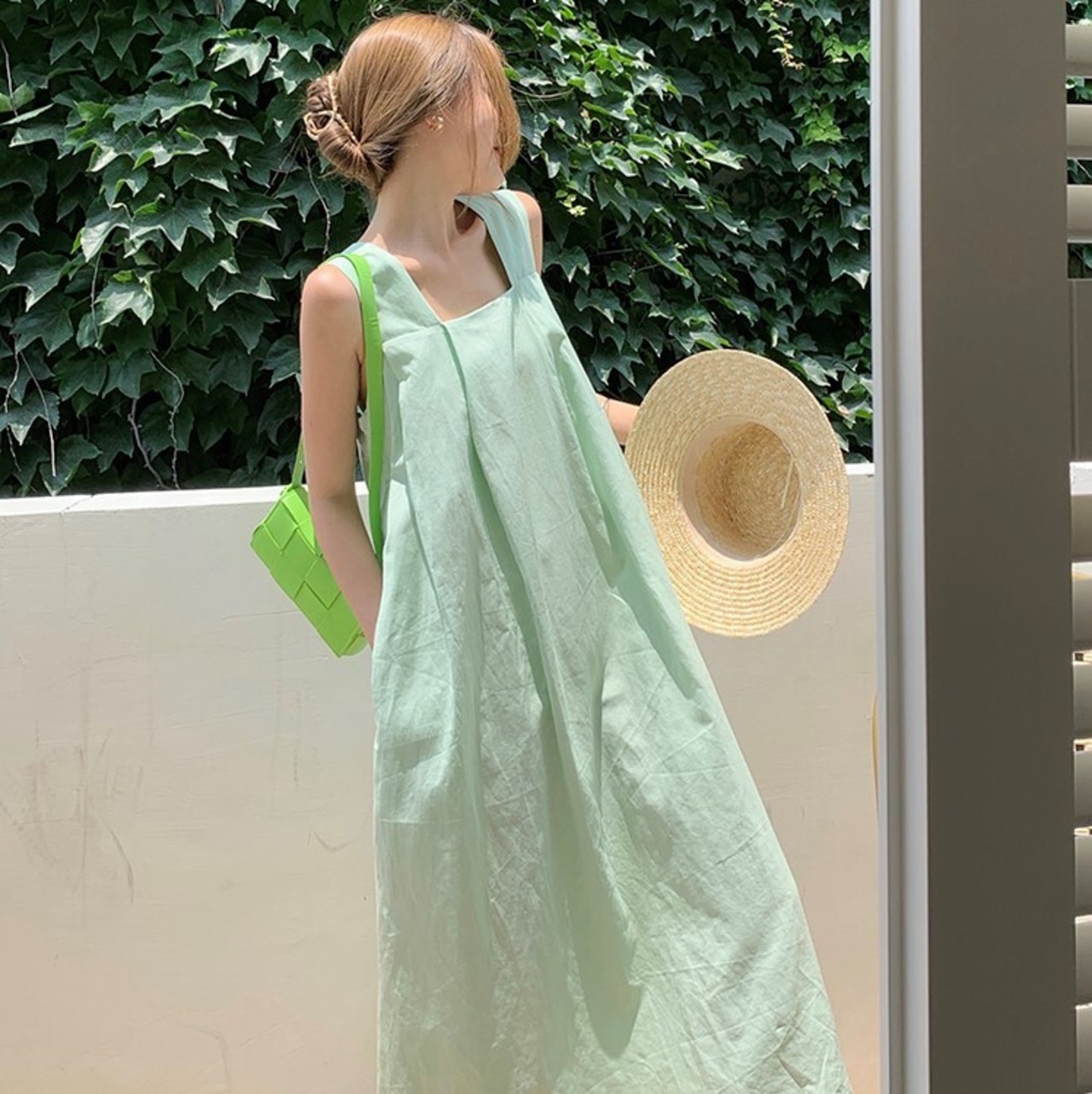 爽やかなミントグリーンが目を引くマキシワンピ。
