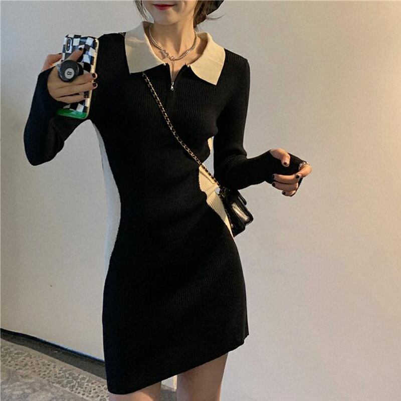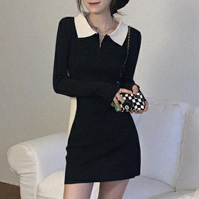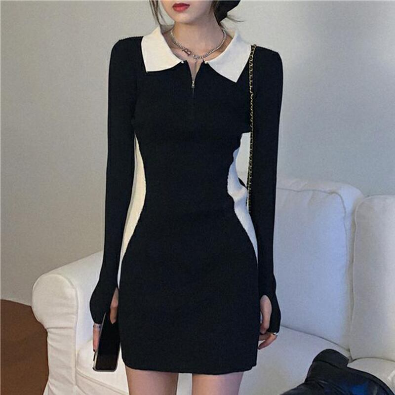 長袖ドレス スカート ドレス ワンステップスカート ミニ ミニ丈 ショート ショート丈 長袖 襟付き スリム タイト 細身 ハイウエスト ニット 大人可愛い きれいめ シンプル カジュアル 大人 上品 おしゃれ お洒落 大人女子 クール セクシー 無地 冬 誕生日 お呼ばれ 10代 20代 レディース デート パーティー イベント ホテル レストラン ファッション コーデ スタイル 穴あき S M 黒 ブラック