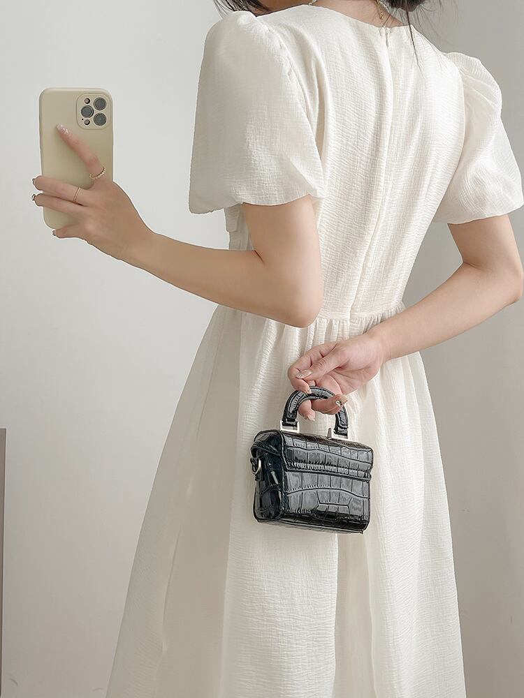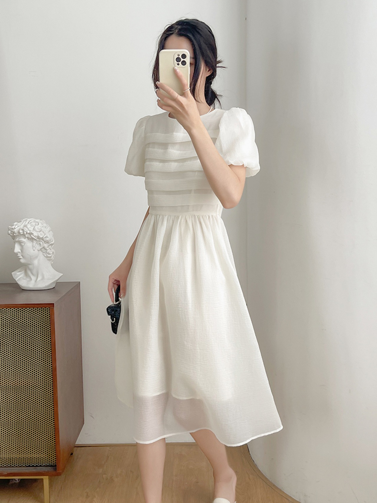 ワンピース ミモレ丈 半袖 パフスリーブ 透け感 かわいい シンプル 上品 お洒落 大人女子 キュート ガーリー フォーマル 春 夏 謝恩会 二次会 10代 20代 30代 40代 レディース 女性用 ママ OL デート お出かけ 女子会 休日 パーティー イベント ホテル レストラン ファッション コーデ スタイル モテ S M ホワイト