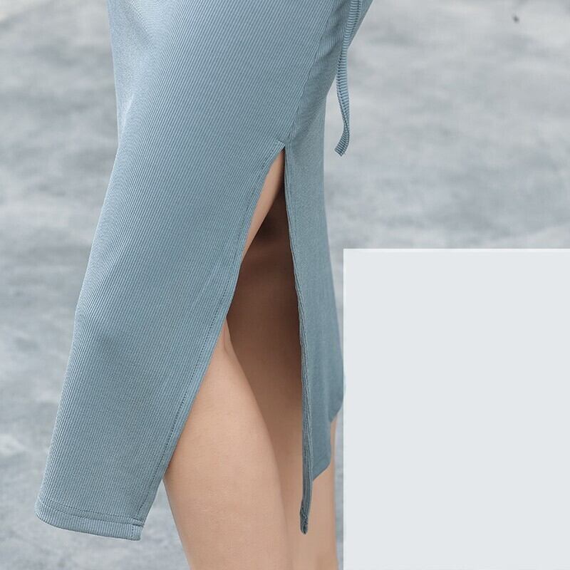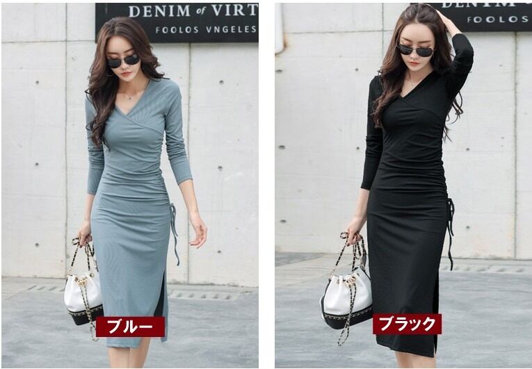 ワンピース レディース スリットワンピ Tシャツワンピ S M L XL ブルー 青 ブラック 黒 無地 春 秋 長袖 Vネック スリット サイドスリット ギャザー ミドル丈 ミドル ミディ丈 ミディ 膝丈 タイト スリム フィット ハイウエスト 脚長 美脚 スタイルアップ 着やせ フェミニン ナチュラル きれいめ きれカジ カジュアル モテ 大人 大人可愛い 存在感 主役級 こなれ感 ぬけ感 デート お出かけ 休日 デート 万能 着回し ユニーク スタイリッシュ クール かっこいい 韓国 オルチャン
