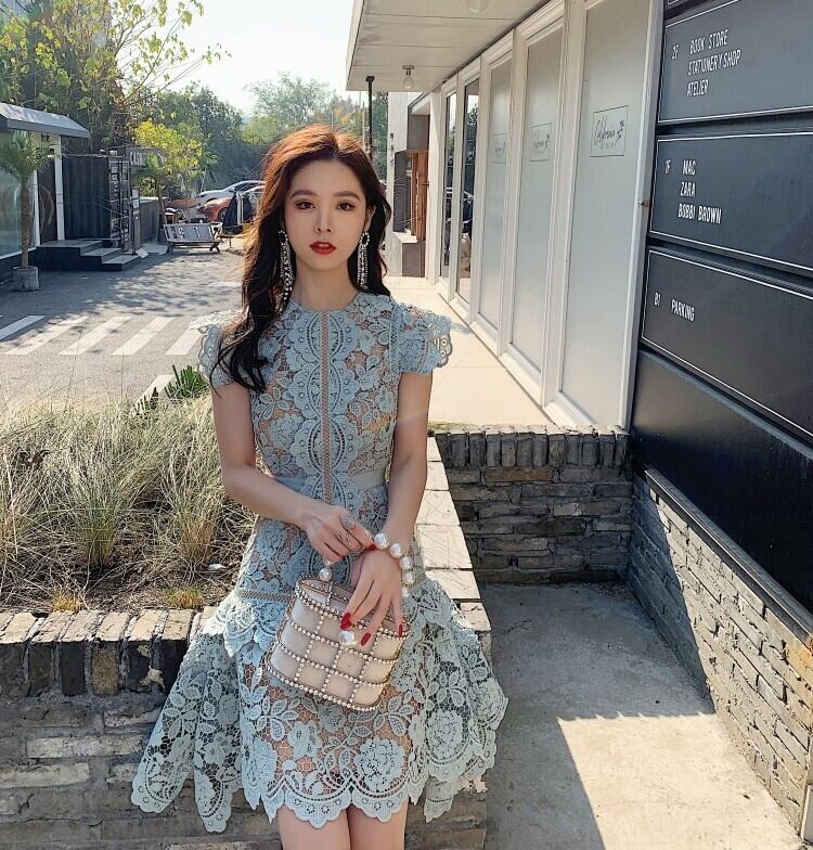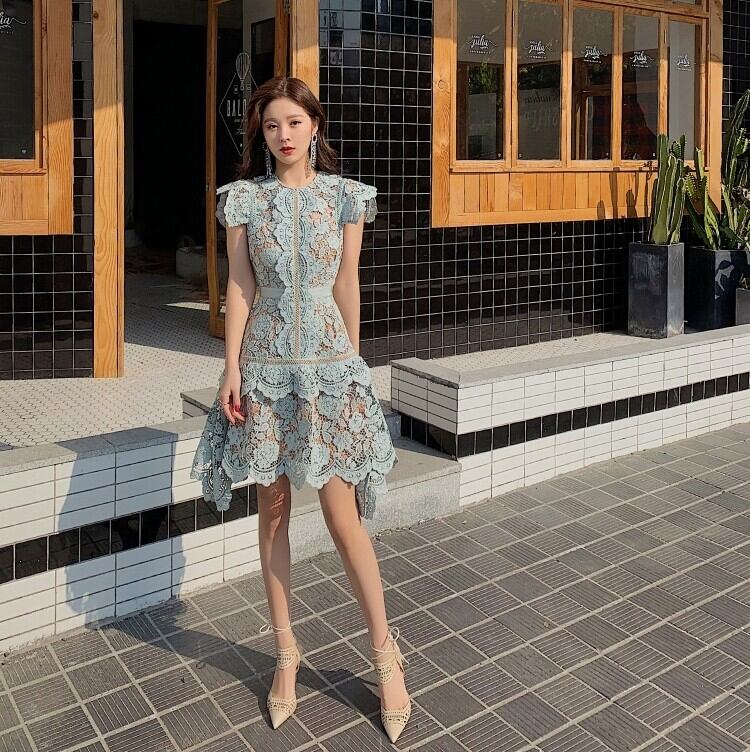 ドレス レディース パーティードレス ミニドレス ワンピース XS S M L XL ブルー 青 大人カラー くすみカラー レース フラワーレース シースルー 透け感 セクシー 肌見せ クルーネック 半袖 フレンチスリーブ フレア Aライン ふんわり ミニ丈 ミニ シュート丈 ショート 膝上 ハイウエスト 美脚 脚長 フェミニン ナチュラル モテ ガーリー キュート 大人 大人可愛い 上品 エレガント 華やか 存在感 主役級 パーティー 2次会 1.5次会 女子会 謝恩会 お呼ばれ 衣装 韓国 オルチャン
