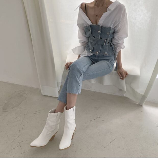 セットアップ シャツ ベスト Gパン チューブトップ 白シャツ スキニーパンツ ミモレ丈 袖あり 長袖 襟付き タイト 細身 ベルト ブルーデニム 3点セット スリーピース きれいめ おしゃれ かっこいい こなれ感 個性的 クール 主役級 存在感 スパイシー ニッチ 無地 春 秋 10代 20代 レディース 女の子 学生 デート お出かけ 休日 イベント 旅行 散歩 重ね着 オルチャン ファッション スタイル インスタ映え サイズ S M L ライトブルー
