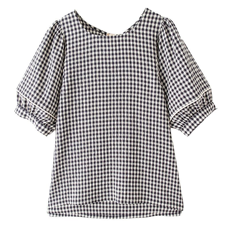 バックリボン チェック パフスリーブ トップス ブラウス レディース バックデザイン 大きめ ゆったり 大きめサイズ 上品 エレガント こなれ感 おしゃれ オシャレ 春 夏 半袖 5分袖 ふんわり ガーリー キュート 可愛い 大人可愛い 大人女子 ゆめかわ 20代 30代 40代 リボン 黒チェック ギンガムチェック
