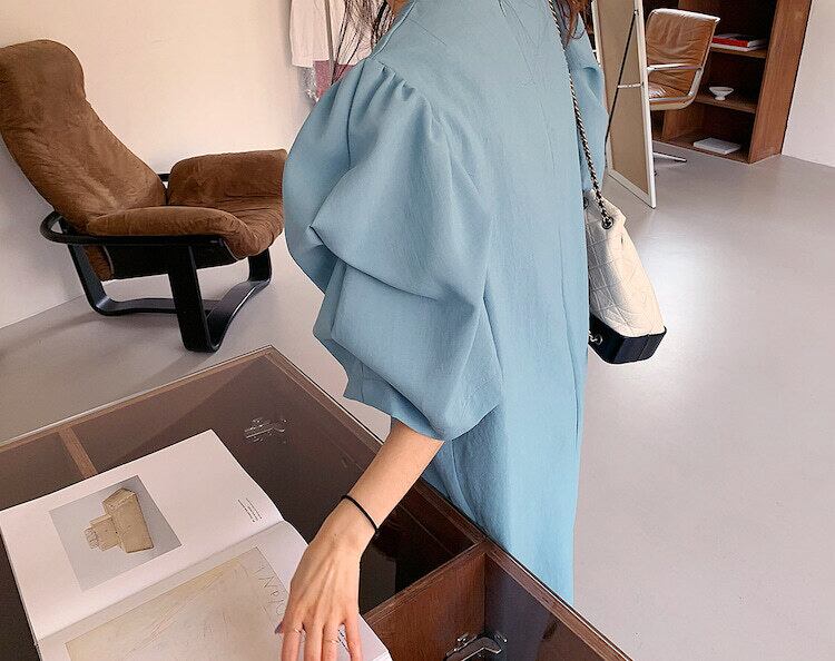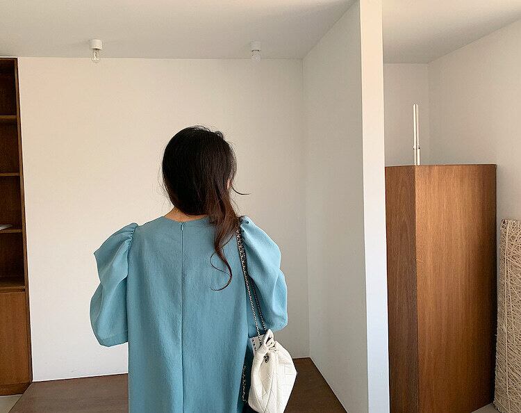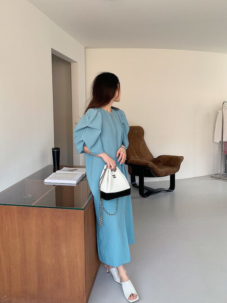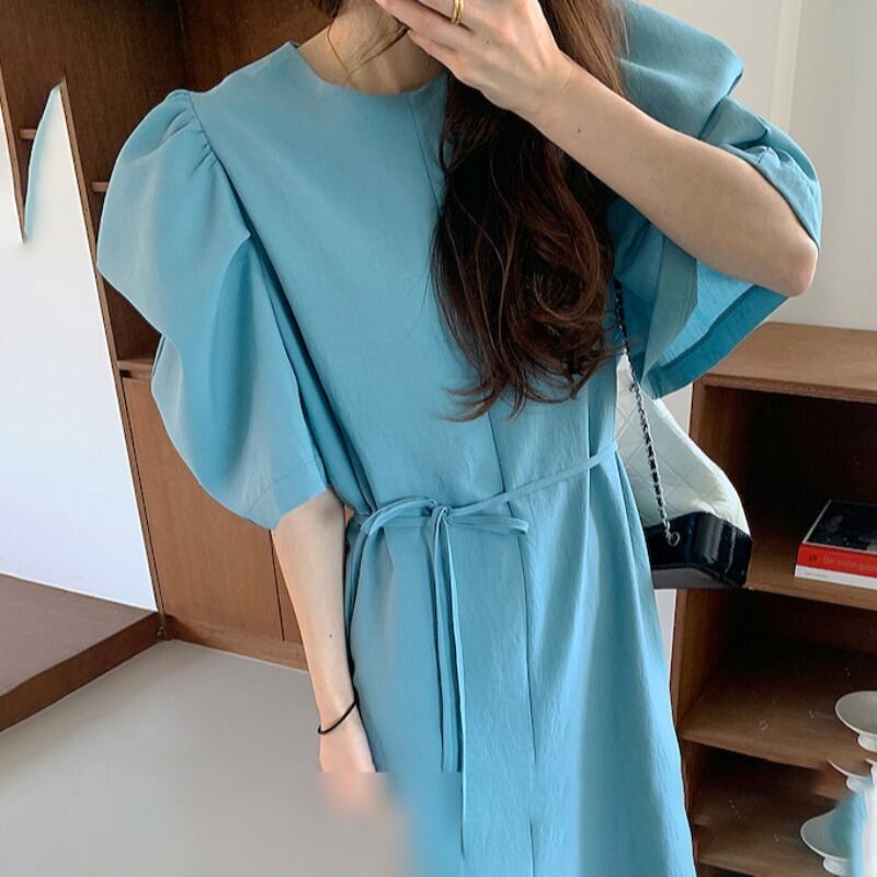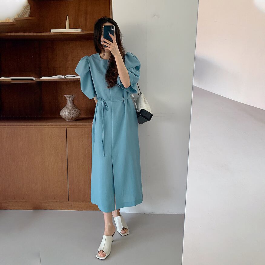ワンピース レディース ロング丈 袖あり ボリューム袖 5分袖 五分袖 ラウンドネック 襟なし ストレート リボン ウエストリボン フロントスリット かわいい 大人可愛い きれいめ 大人 上品 おしゃれ お洒落 こなれ感 キュート 個性的 エレガント 主役級 存在感 とろみ感 ワンサイズ フリーサイズ 無地 水色 ライトブルー 春 夏 秋 誕生日 10代 20代 30代 40代 ママ デート お出かけ お呼ばれ 女子会 休日 パーティー イベント 旅行 リゾート モテ 韓国 オルチャン