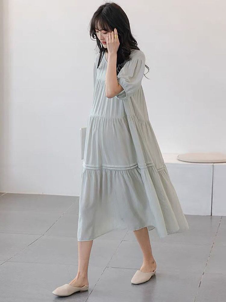 ワンピース レディース ティアードワンピース ミモレ丈 袖あり 半袖 五分袖 5分袖 パフスリーブ ラウンドネック 襟なし ティアード かわいい おしゃれ お洒落 ラブリー キュート ガーリー ルーズ 主役級 存在感 とろみ感 抜け感 ワンサイズ フリーサイズ ライトイエロー ライトブルー ライトグリーン 青 緑 黄色 無地 春 夏 秋 10代 20代 30代 ママ マタニティ お出かけ デート 女子会 休日 イベント リゾート 旅行 海 プール 体型カバー 普段使い お揃い 双子 韓国 オルチャン