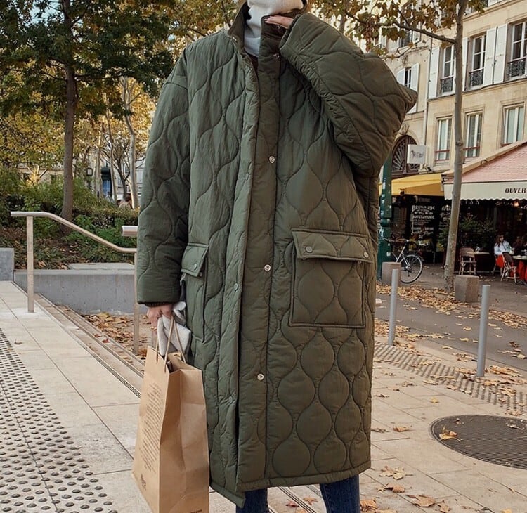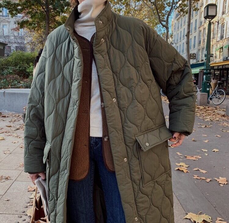 ロングコート レディース アウター コート S M L XL アーミーグリーン 緑 ブラック 黒 フードなし ポケット付き スタンドカラー キルティング ロング丈 ロング ミドル丈 ミディ丈 膝下 冬 防寒 防風 あったか フェミニン ナチュラル カジュアル きれいめ きれカジ クール スタイリッシュ かっこいい モード 定番 万能 着回し 王道 シンプル ベーシック ストレート ゆったり ゆる ルーズ オーバーサイズ 体型カバー 着やせ 休日 デート お出かけ 通勤 OL 通学 学生 韓国 オルチャン