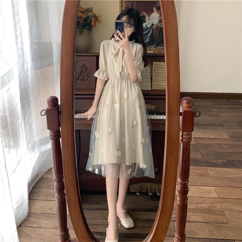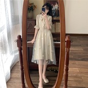 夏 ロング ドレス ワンピース プルオーバー ワンピドレス 膝丈 ロング丈 袖あり 半袖 ラウンドネック 襟付き Aライン レース ウエストゴム 普通生地(春夏用) かわいい 上品 お洒落 レトロ ラブリー モダン 無地 夏 10代 レディース 女性用 学生 デート お出かけ 女子会 休日 パーティー イベント ホテル ガーデン レストラン スタイル モテ インスタ映え S M L ゆったり グリーン アプリコット
