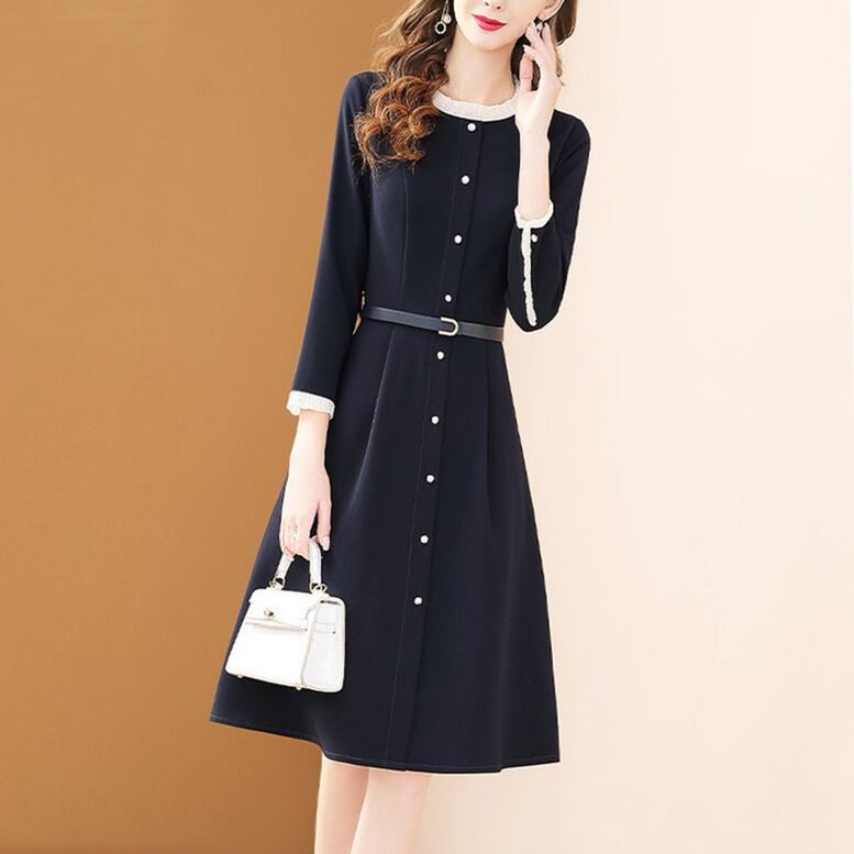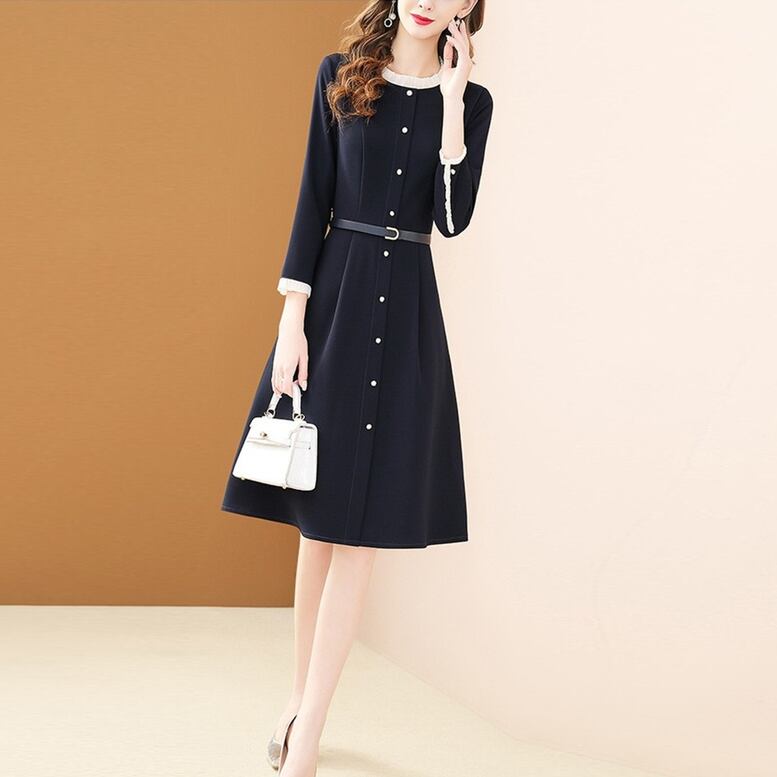 クラシカルワンピース ワンピース レディース ミディ丈ワンピース バイカラー フリルネック 袖口フリル フロントボタン ベルト付き ミディアム ドレス フェミニン 長袖 紺 ネイビー ワンピドレス 大人可愛い きれいめ 上品 ガーリー エレガント フォーマル 春 夏 秋 冬 二次会 お呼ばれ 謝恩会 結婚式 披露宴 セレモニー オフィス ビジネス OL 通勤 学生 通学 デート お出かけ パーティー イベント 女子会 休日 体型カバー 美脚 モテ ゆったり インスタ映え 大人カラー ニュアンスカラー