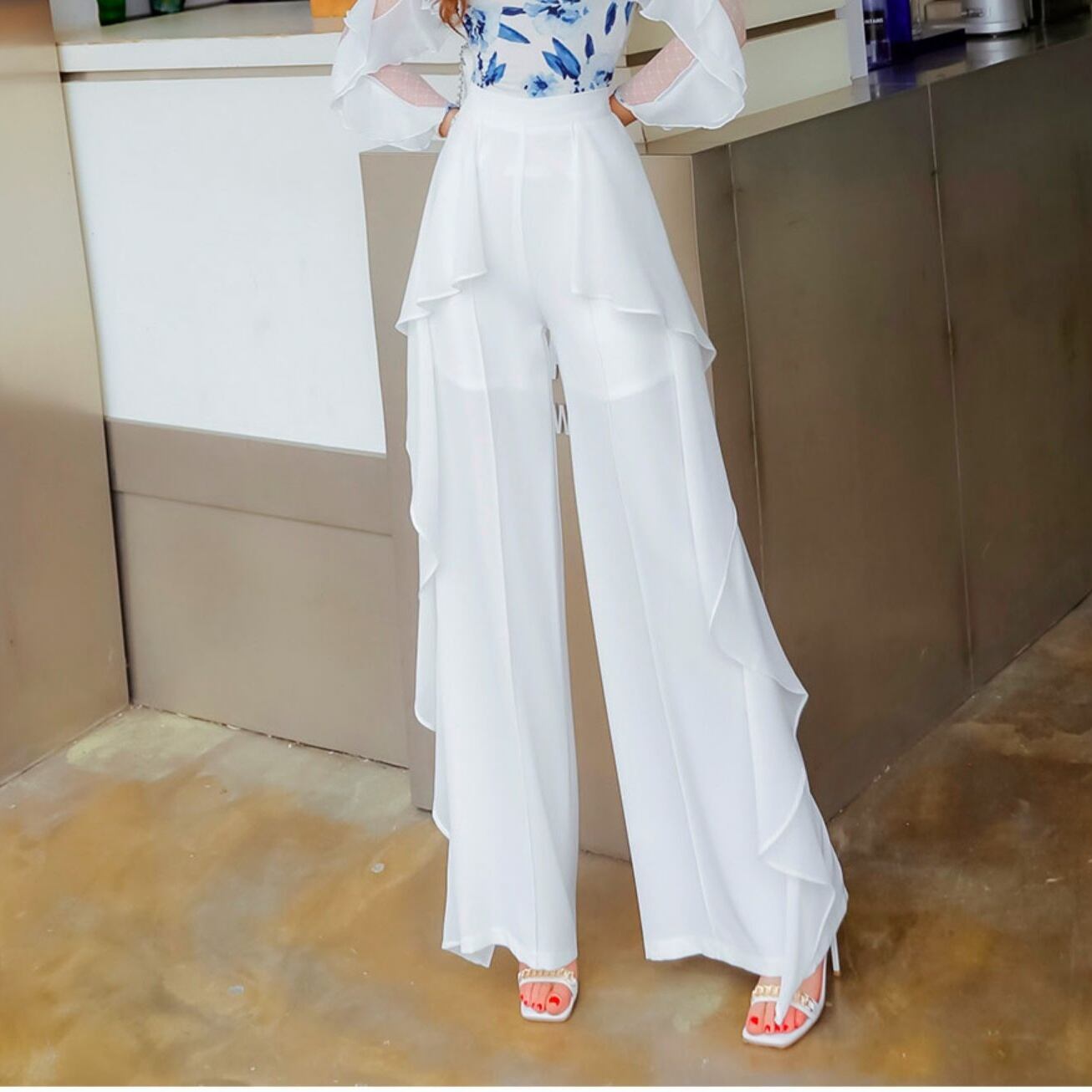 フレアパンツ 春 夏 サイドデザイン ワイドパンツ レディース フレア サイド シースルー ボリューム フリル ハイウエスト 細見え 美脚 体型カバー ゴージャス 透け感 こなれ感 主役 存在感 ふんわり クール 上品 個性派 個性的 スカート Iライン Aライン 裏地 エレガント 無地 カジュアル 巻きスカート ふんわり ゆったり ロング ロング丈 大きめ 大きいサイズ 2XL 3XL お洒落 オシャレ かわいい 大人可愛い 大人女子 20代 30代 40代 パンツ ズボン ボトムス