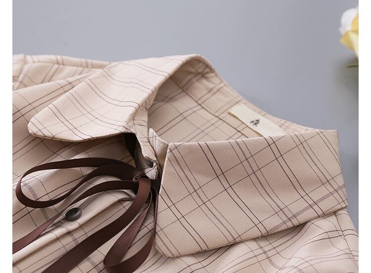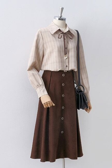 チェック柄のブラウスと、ミモレ丈のAラインスカートのお得なセットです。