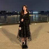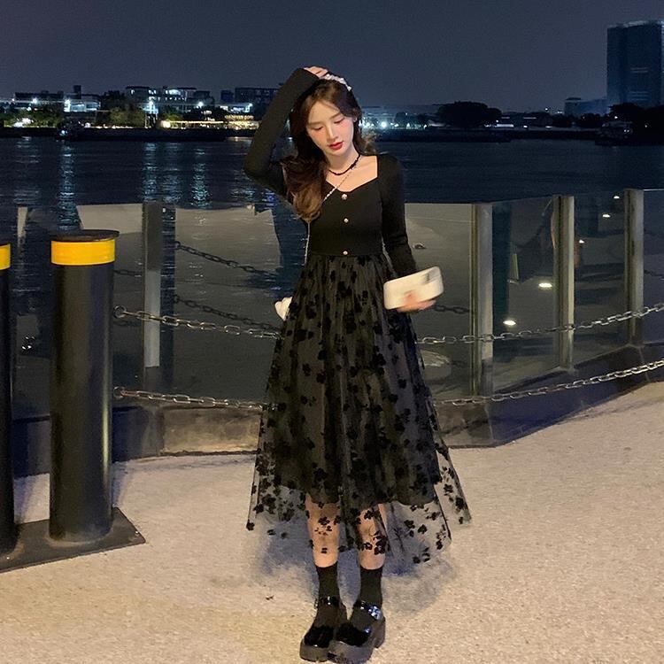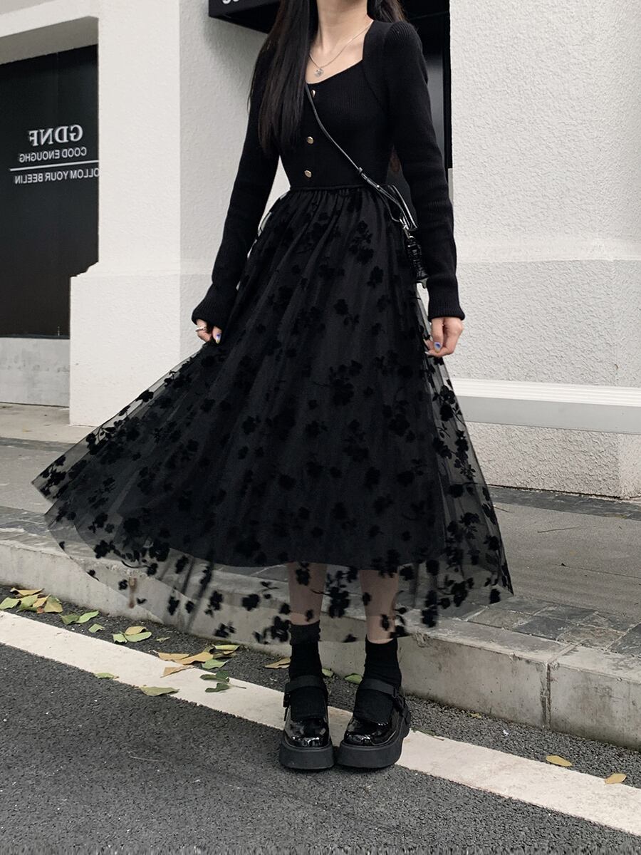 ロングスカートドレス スカート ボトムス ドレス ロングスカート ミディスカート ミモレ ミモレ丈 ロング ロング丈 長袖 ラウンドネック Aライン 切り替えデザイン ハイウエスト メッシュ ニット かわいい 大人可愛い きれいめ シンプル 大人 上品 おしゃれ お洒落 大人女子 ラブリー キュート ガーリー クール モード系 無地 花柄 フラワー 秋 冬 お呼ばれ 10代 20代 30代 レディース デート パーティー イベント ホテル レストラン S M L XL 黒 ブラック