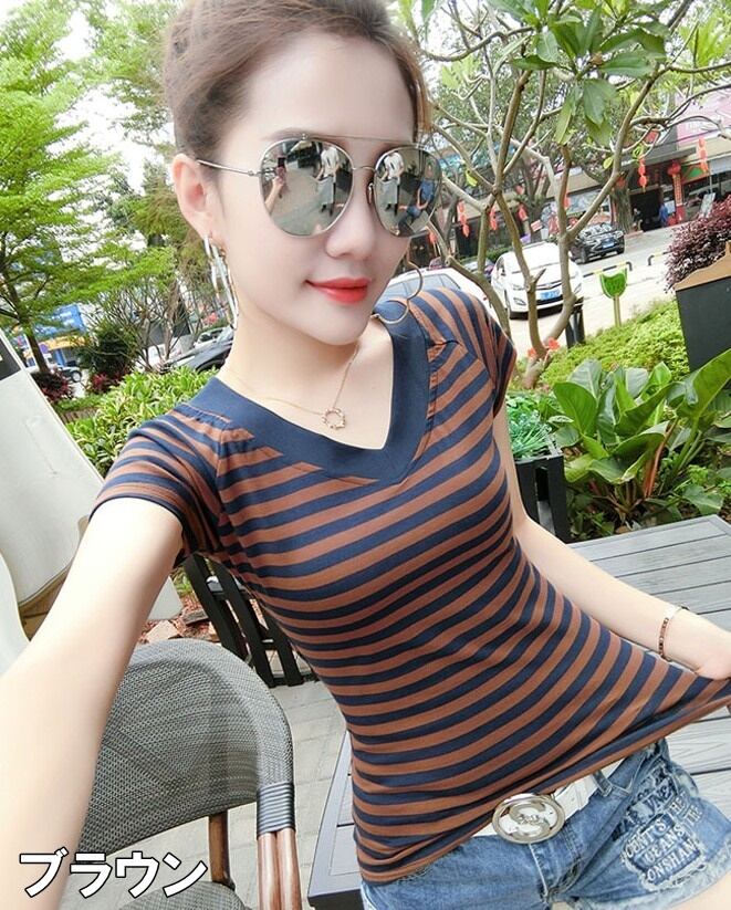 Tシャツ レディース トップス カットソー S M L XL 2XL 3XL 大きいサイズ プラスサイズ ホワイト 白 グリーン 緑 ブラウン 茶色 大人カラー ボーダー しましま 春 夏 Vネック 半袖 ショート丈 ミドル丈 ストレート スリム 細身 タイト ママ ストカジ フェミニン ナチュラル カジュアル きれいめ きれカジ 大人 大人可愛い こなれ感 ぬけ感 存在感 主役級 休日 お出かけ 定番 万能 着回し シンプル ベーシック マリン モテ 通学 学生 ルームウェア 部屋着 韓国 オルチャン