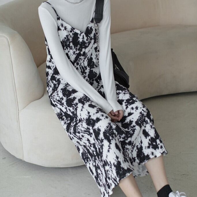 トップス付きサスペンダーワンピ トップス スカート ワンピース ミディスカート ロング ロング丈 アンクル丈 ミディアム丈 長袖 Vネック タートルネック 細身 2点セット かわいい 大人可愛い きれいめ シンプル おしゃれ お洒落 レトロ ルーズ クール エレガント 花柄 春 秋 10代 20代 30代 レディース 女性用 ママ 通勤 学生 通学 デート お出かけ 公園デビュー 女子会 休日 ガーデン 普段使い ファッション コーデ スタイル 楽ちん S M L 白 ホワイト 黒 ブラック