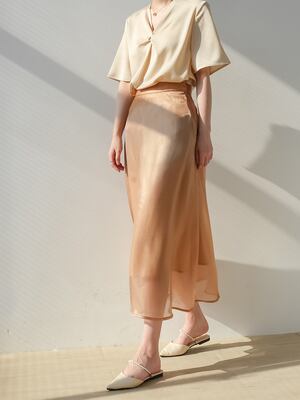 程よい艶感とシャンパンゴールドのカラーがゴージャスなスカートです。