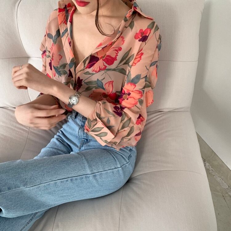 花柄シャツ トップス ブラウス 長袖 シフォン かわいい 大人可愛い カジュアル おしゃれ お洒落 レトロ ラブリー キュート ガーリー ルーズ 個性的 クール 主役級 花柄 フラワー 春 夏 秋 10代 20代 レディース デート お出かけ 女子会 休日 アウトドア イベント リゾート 旅行 海 プール 普段使い ファッション コーデ スタイル S M L XL 2XL 青 ブルー オレンジ