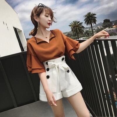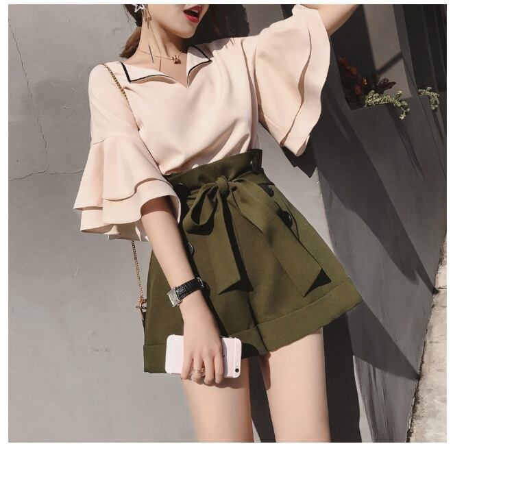上下セット ブラウス ショートパンツ セットアップ 3色 レディース 袖フリル 袖フレア ハイウエスト ショート キュロット 短パン Aライン リボン 20代 30代 40代 ゆったり 大きいサイズ XL 2XL くすみカラー 選べる お得 2点セット 個性的 個性派 お洒落 オシャレ かわいい 大人可愛い 大人女子 体型カバー 細見え 脚長 美脚 華奢 豪華 ゴージャス カジュアル シンプル エレガント 無地 シンプル 春 夏 半袖 五分袖 ボリューミー