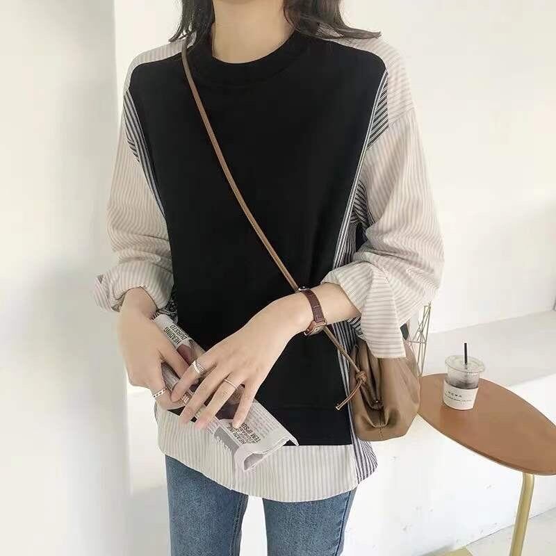 トップス レディース プルオーバー トレーナー 長袖 ラウンドネック クルーネック ストライプ トレンド 異素材 レイヤード風 ゆったり オーバーサイズ ドッキング ドロップショルダー 体型カバー 着痩せ ルーズ 重ね着風 個性的 大人可愛い カジュアル フェミニン 韓国 キュート おしゃれ お洒落 お買い物 ママコーデ 春 秋 冬 ロングシーズン お出かけ デート 女子会 通学 学生 普段着 普段使い 着回し 休日 白 ホワイト 黒 ブラック フリーサイズ 10代 20代 30代 40代