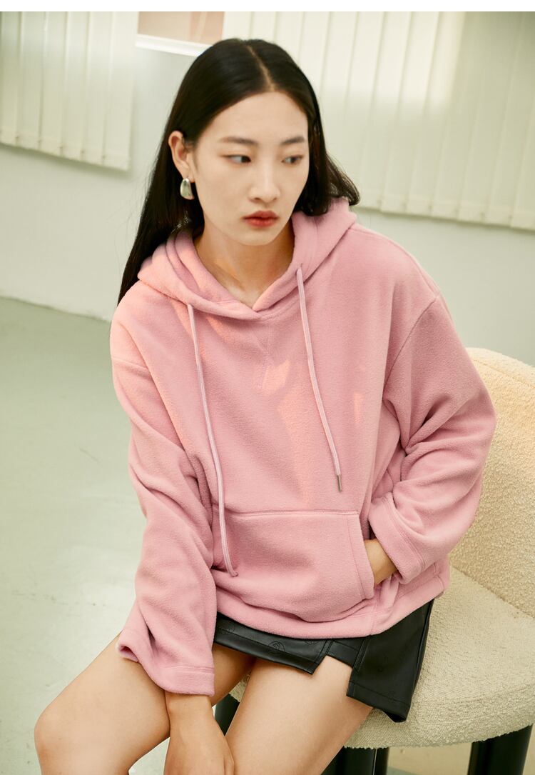 トップス レディース パーカー フリース 袖あり 長袖 ドロップショルダー フーディー フード付き ポケット もこもこ モコモコ ふわふわ かわいい シンプル カジュアル おしゃれ お洒落 ラフ こなれ感 抜け感 S M L ピンク 桃色 無地 春 秋 冬 10代 20代 30代 40代 学生 通学 公園デビュー 女子会 お泊り 休日 アウトドア 旅行 着回し 普段使い 普段着 韓国 オルチャン ファッション コーデ スタイル 楽ちん あったか 暖かい 防寒