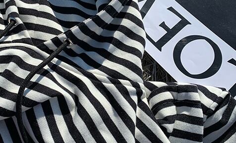 細めのボーダーに大きめフードがかわいいカットソーです。