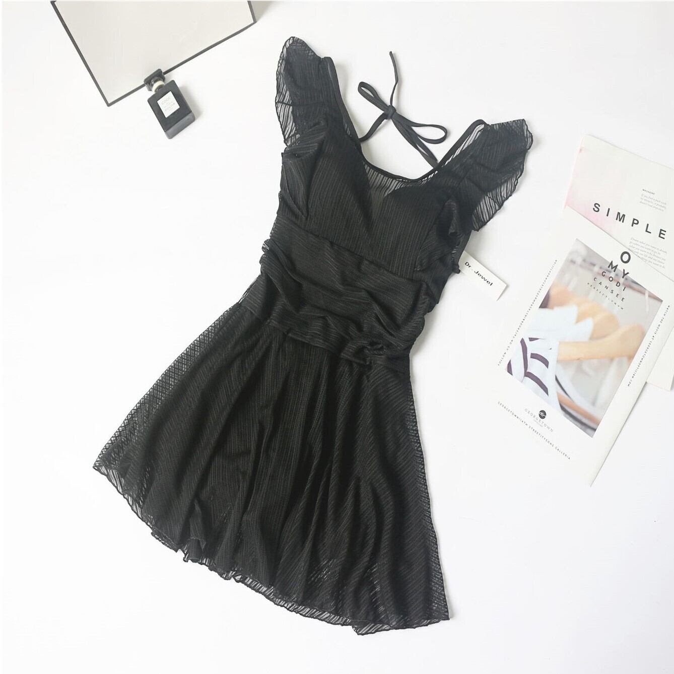 水着 スイムウェア ワンピース水着 体系カバー水着 スカパン ワンピース ホルターネック 紐 体系カバー シフォン フリル ウエストマーク 透け感 シースルー 谷間魅せ 盛れる 大人可愛い セクシー 大人 大人っぽい おしゃれ キュート レディース 女性用 着痩せ スタイルアップ 韓国 韓国系 オルチャン トレンド S M L XL 黒 ブラック