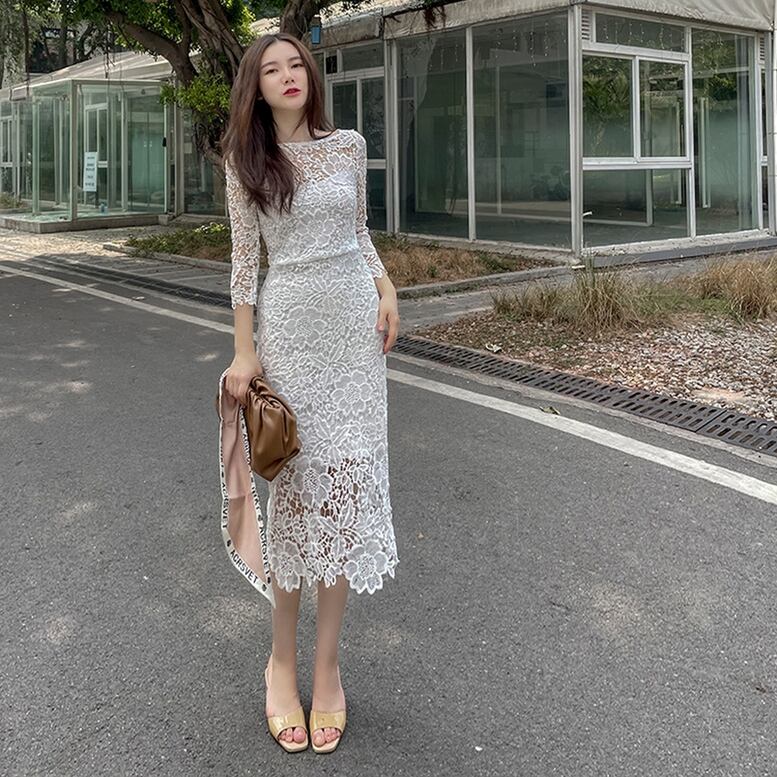 総フラワーレースワンピース ワンピース ドレス レディース 総レースワンピース 結婚式ドレス パーティードレス ミディ丈ドレス タイト 7分袖 花柄 刺繍 レース ボートネック 透け感 シースルー 白 ホワイト ワンピドレス パーティドレス 大人可愛い きれいめ 上品 ガーリー エレガント フォーマル 春 夏 秋 冬 二次会 お呼ばれ 謝恩会 結婚式 披露宴 セレモニー オフィス ビジネス OL 通勤 学生 通学 デート お出かけ パーティー イベント 女子会 体型カバー 美脚 ゆったり インスタ映え