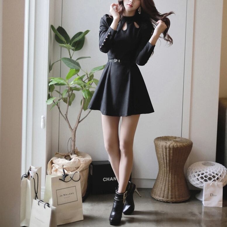 カッティングフレアミニワンピース ワンピース レディース ミニワンピース フレア ドレス ハイネック ドロップカット 長袖 ウエストベルト タイト 袖口ボタン ショート丈 スタンドカラー 黒 ブラック ワンピドレス パーティドレス 大人可愛い きれいめ 上品 ガーリー エレガント フォーマル 春 夏 秋 冬 二次会 お呼ばれ 謝恩会 結婚式 披露宴 セレモニー オフィス ビジネス OL 通勤 学生 通学 デート お出かけ パーティー イベント 女子会 体型カバー 美脚 モテ ゆったり インスタ映え
