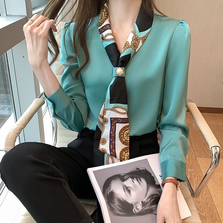 ブラウス スカーフ 長袖 Vネック レディース リボン タイ パール ボタン きれいめ 上品 エレガント 高級感 パフスリーブ ゴージャス 大きいサイズ 大きめ XL 2XL オシャレ お洒落 かわいい 大人可愛い 大人女子 ОL オフィス 通勤 セクシー モード パーティー 白 ホワイト グリーン 緑 ブルー 青 エスニック 個性的 個性派 20代 30代 40代 50代 トップス シャツ カットソー 入学式 卒業式 主役 存在感 こなれ感