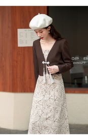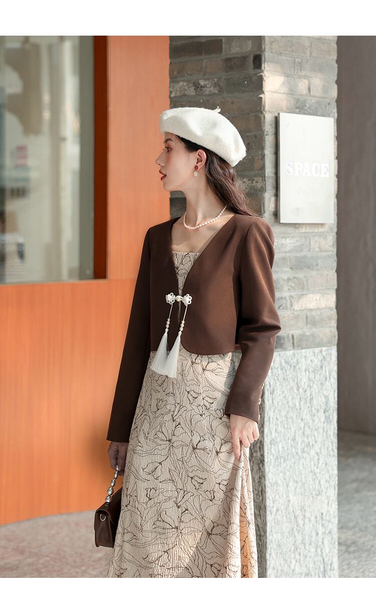 ブラウンのノーカラージャケットとキャミソールワンピースのセットアップ。