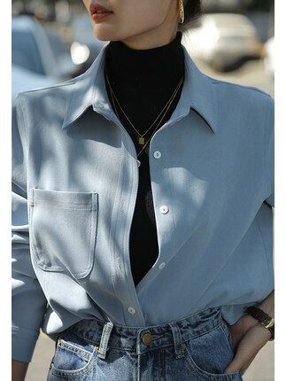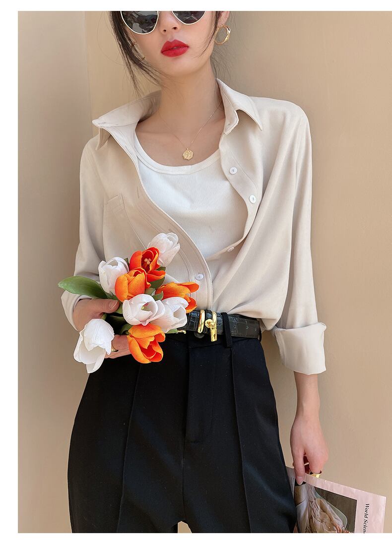 ブラウス 7色 スウェード 長袖 レディース トップス 秋 冬 シャツ くすみカラー きれいめ 上品 シンプル カジュアル 無地 着回し ゆったり 大きいサイズ 大きめ XL ストレート Iライン お洒落 オシャレ 大人 ブラウン 茶色 イエロー 黄色 ピンク 青 水色 ブルー 厚手 ОL オフィス 通勤 仕事 かわいい 大人可愛いエレガント 前開き ラフ スキッパー ステンカラー レギュラーカラー 襟付き 30代 40代 50代 重ね着 ポケット