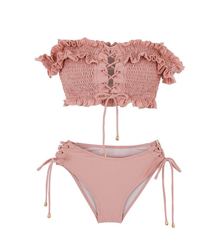 水着 ビキニ バンドゥビキニ セクシービキニ セパレート バンドゥ オフショルダー 紐 二の腕カバー レースアップ 伸縮性 胸元 谷間魅せ 盛れる セット 上下セット 2点セット ツーピース かわいい 大人可愛い セクシー 華やか おしゃれ 主役級 キュート 無地 レディース 夏 海 ビーチ プール リゾート 旅行 二の腕カバー 韓国 スタイル トレンド M L XL 大きいサイズ 黒 ブラック 茶色 ブラウン ピンク くすみカラー カラバリ