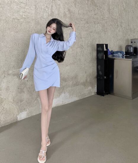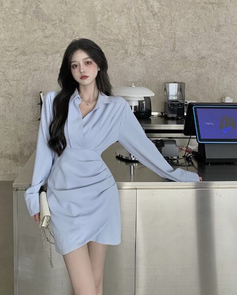 ワンピース シャツ シャツワンピース ミニ丈 袖あり 長袖 萌袖 Vネック 襟付き ポロカラー ウエストマーク ギャザー 薄手 きれいめ シンプル カジュアル 大人 上品 かっこいい こなれ感 ルーズ 個性的 クール モード系 セクシー エレガント 抜け感 無地 春 秋 20代 30代 40代 レディース 女性用 女の子 デート お出かけ お泊まり 休日 パーティー イベント リゾート 旅行 ホテル レストラン 普段使い オルチャン ファッション モテ サイズ S M L ライトブルー