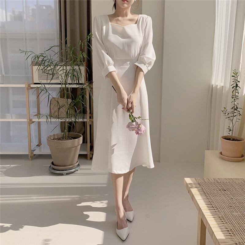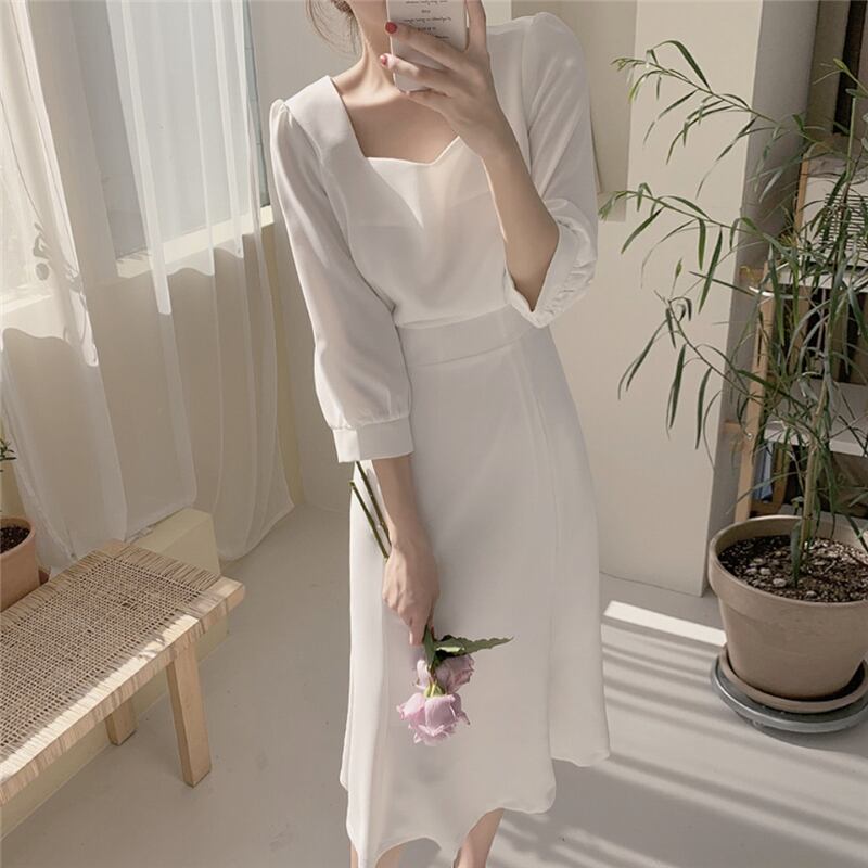 夏 フレンチ ドレス ドレス ワンピース パーティドレス フォーマルドレス ワンピースドレス ワンピドレス ミディアム丈 袖あり 7分袖 スクエアネック 襟なし スリム 細身 レース ファスナー プルオーバー 異素材MIX 大人可愛い きれいめ 上品 おしゃれ レトロ 大人女子 エレガント フォーマル ナチュラル お嬢様 無地 10代 20代 レディース 女性用 ママ OL 学生 デート 休日 パーティー イベント ホテル レストラン ファッション インスタ映え S M L XL ホワイト ブルー