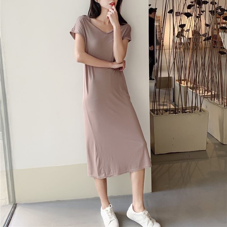 ロングTシャツワンピース ワンピース レディース シャツワンピース ルームウェア Vネック 半袖 ロング丈 とろみ 光沢 ドレス フィット スリム 青 黒 灰色 黄緑 茶色 赤 ベージュ ブルー ブラック グレー イエローグリーン ブラウン レッド アッシュグリーン 大人可愛い きれいめ 上品 春 夏 秋 冬 お出かけ パーティー イベント 女子会 休日 旅行 体型カバー 普段使い 定番 トレンド ゆったり インスタ映え くすみカラー カラバリ 無地