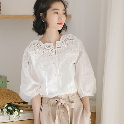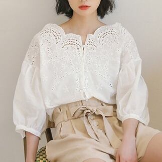 トップス ブラウス スカラップ バルーンスリーブ レディース 半袖 5分袖 7分袖 白 ホワイト ゆったり 大きめ 大きいサイズ オーバーサイズ 体型カバー 細見え ワイド 着痩せ 夏 パフスリーブ レース かわいい 大人可愛い 大人女子 ガーリー 森ガール キュート 甘め 鎖骨 お洒落 オシャレ シンプル カジュアル 清楚 きれいめ 上品 30代 40代 50代 夏 デート リゾート こなれ感 抜け感 セクシー 個性的 個性派 存在感 ルーズ レトロ