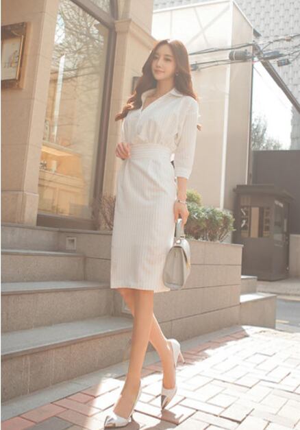 ワンピース シャツ 白シャツ タイトスカート シャツワンピース ひざ丈 袖あり 7分袖 Vネック 襟付き ポロカラー スリム プリーツ 薄手 きれいめ シンプル 大人 上品 大人女子 クール エレガント フォーマル ストライプ 春 夏 入学式 入園式 20代 30代 40代 レディース 女性用 ママ ビジネス OL デート パーティー イベント 旅行 ホテル レストラン オフィスカジュアル 普段使い オルチャン スタイル モテ 脚長 サイズ M L 白