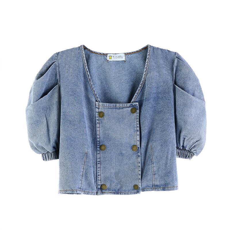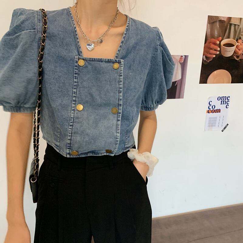 アウター レディース デニムジャケット ショート丈 襟なし パフスリーブ ボリューム袖 半袖 メタルボタン スタッズ スクエアネック かわいい へそ出し カジュアル おしゃれ お洒落 かっこいい こなれ感 ラフ キュート ガーリー 個性的 主役級 存在感 抜け感 S M L XL 2XL 3XL 4XL 5XL 大きいサイズ 大きめ 大きい デニムブルー 青 水色 春 夏 秋 10代 20代 30代 学生 通学 デート お出かけ 女子会 イベント 旅行 リゾート 海 プール モテ 普段使い