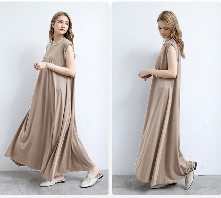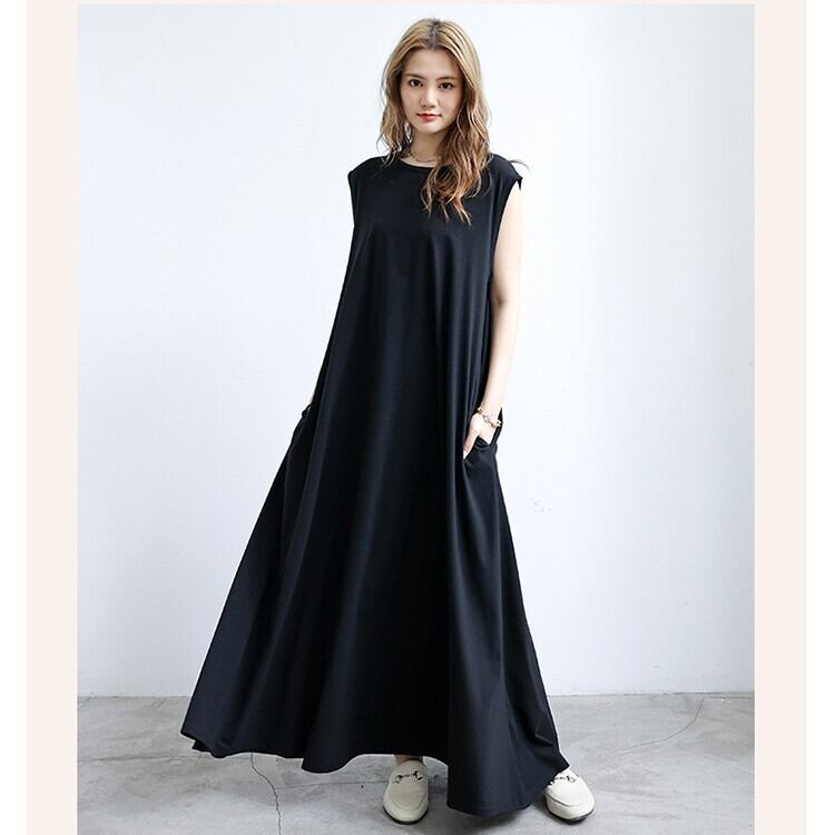 ワンピース フレアワンピース ロング マキシ ノースリーブ フレンチスリーブ ラウンドネック ワイド Aライン ポケット 綿 ポリエステル 大人可愛い シンプル カジュアル おしゃれ 大人女子 こなれ感 ラフ ルーズ 主役級 存在感 無地 春 夏 秋 10代 20代 30代 40代 50代 60代 レディース 女性用 デート お出かけ 公園デビュー 女子会 休日 リゾート 旅行 海 着回し 普段使い 重ね着 体系カバー M L XL ブラック ネイビー グレー レッディッシュブラウン カーキ ベージュ