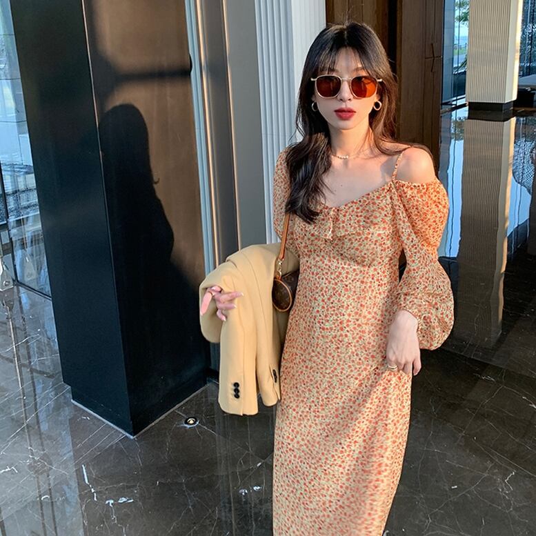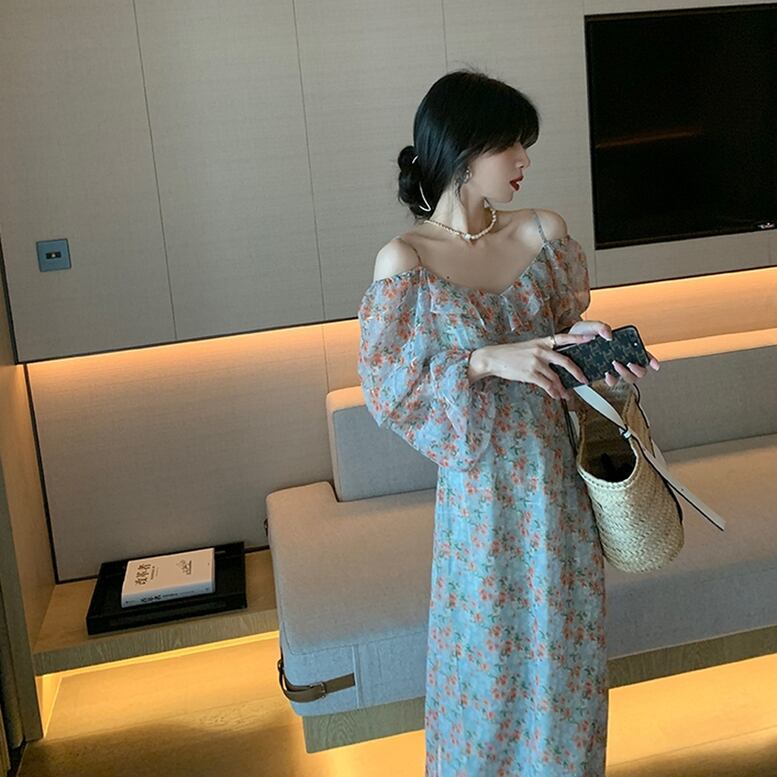 小花柄オフショルシフォンワンピース ワンピース レディース 花柄ワンピース オフショルダー 袖あり 長袖 Vネック ハイウエスト ロングワンピース 総柄 ボタニカル ドレス バックスリット 小さいサイズ 水色 黄色 ブルー イエロー ローズピンク 大人可愛い きれいめ 上品 エレガント フォーマル ガーリー 春 夏 秋 冬 二次会 お呼ばれ オフィス ビジネス OL 通勤 学生 通学 デート お出かけ パーティー イベント 女子会 体型カバー ゆったり インスタ映え ニュアンスカラー