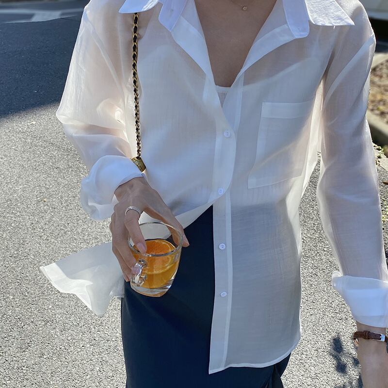 ゆったりシルエットの透け感のあるシンプルな長袖シャツ。