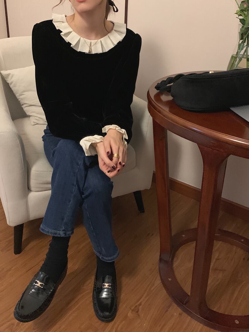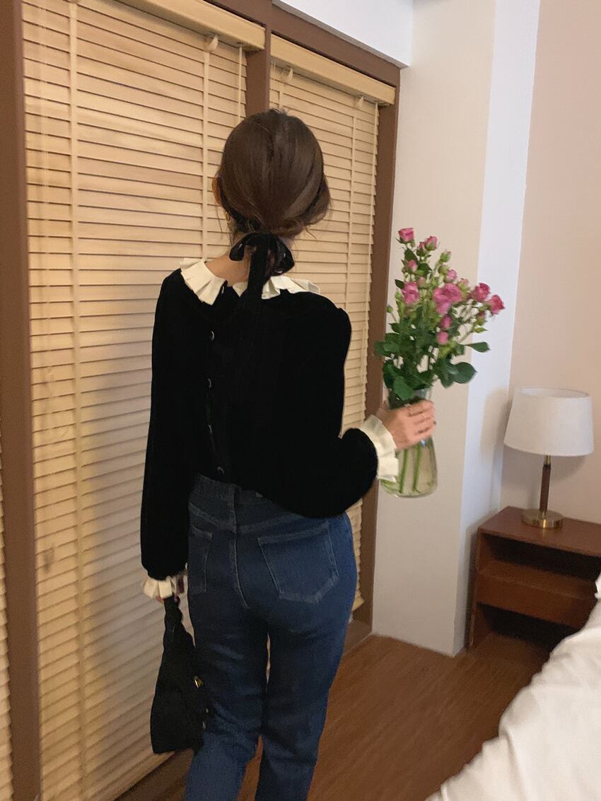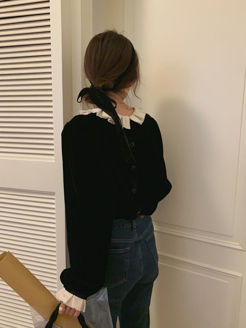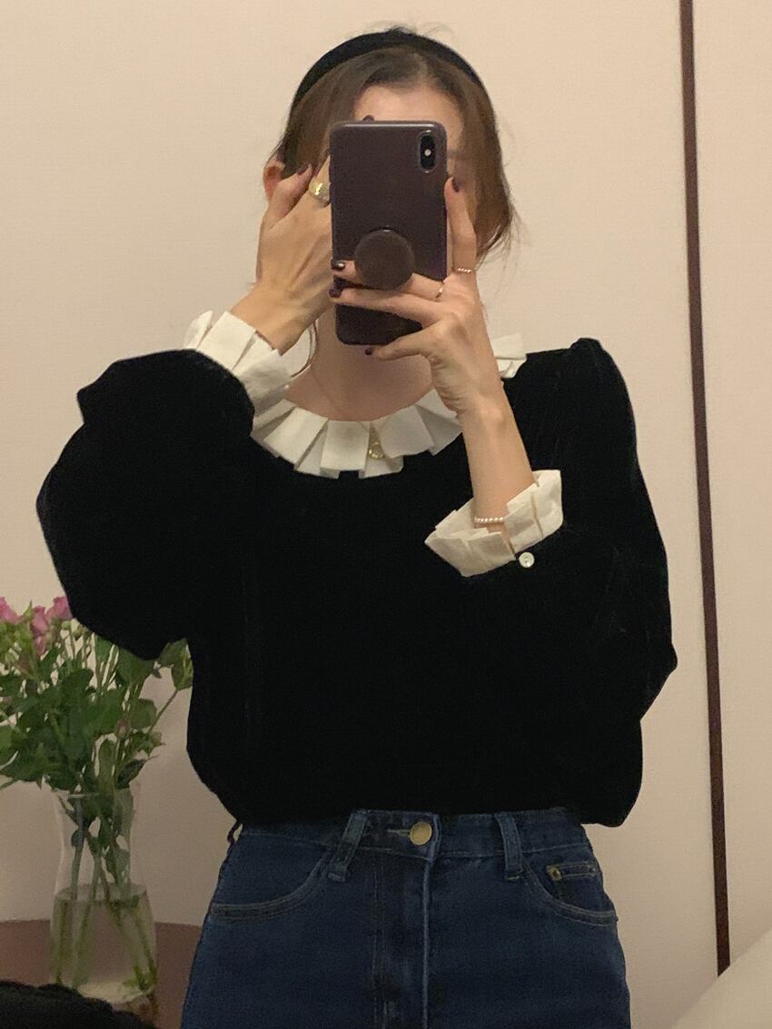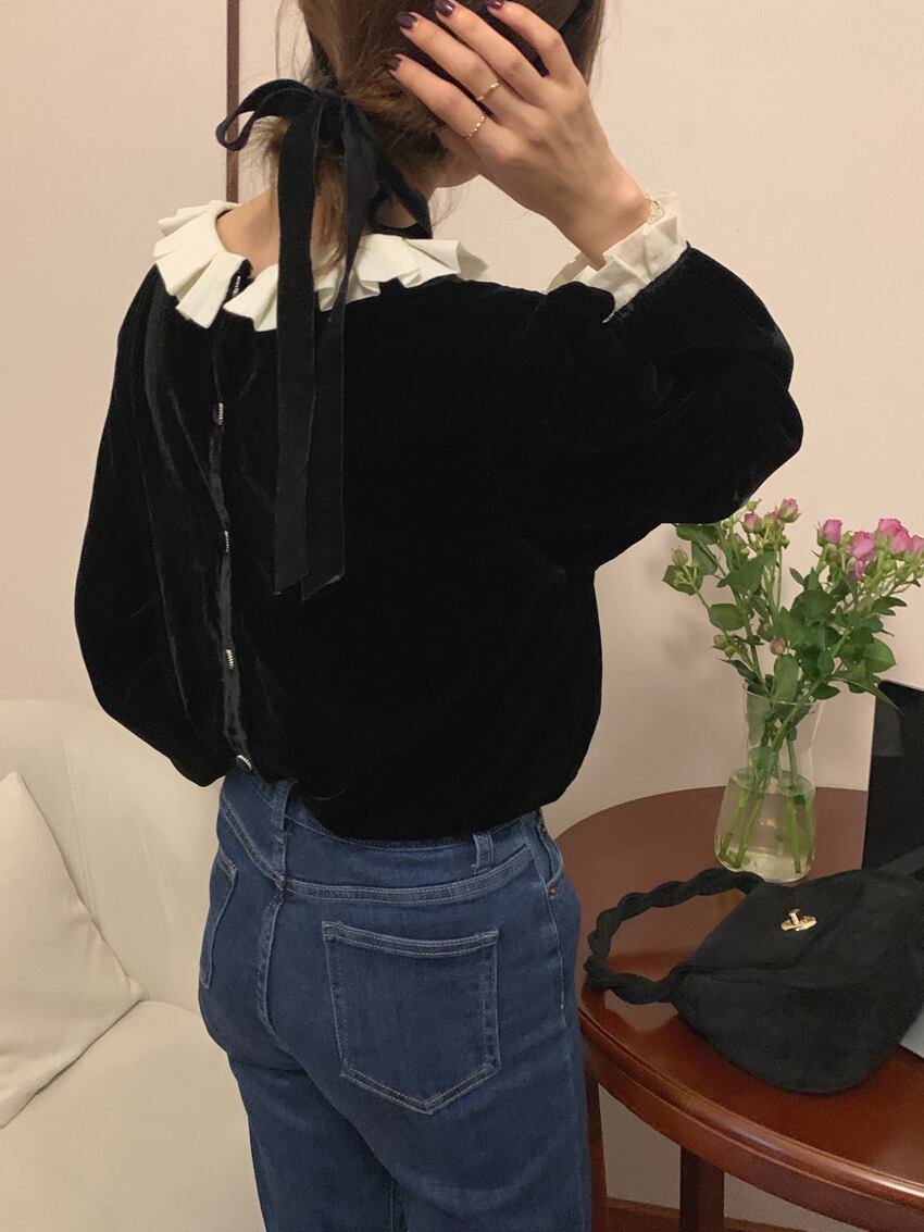 秋 フレンチ トップス トップス シャツ ショート丈 袖あり 長袖 ラウンドネック 襟付き フリル ふわふわ 透け感 ボタン 異素材MIX かわいい 大人可愛い きれいめ カジュアル 大人 上品 お洒落 レトロ 大人可愛い 大人女子 キュート クール 無地 秋 30代 レディース 女性用 ママ 女の子 オフィス ビジネス OL 通勤 学生 通学 女子会 休日 パーティー イベント ホテル ガーデン 重ね着 スタイル 暖かい インスタ映え ワンサイズ ブラック