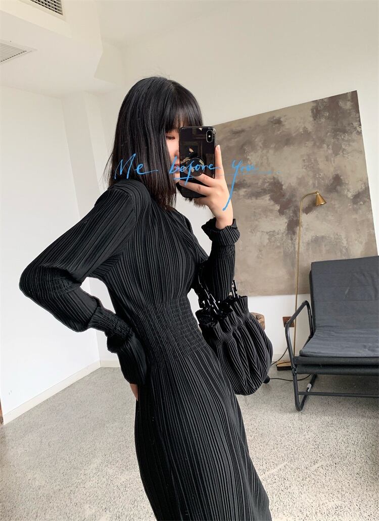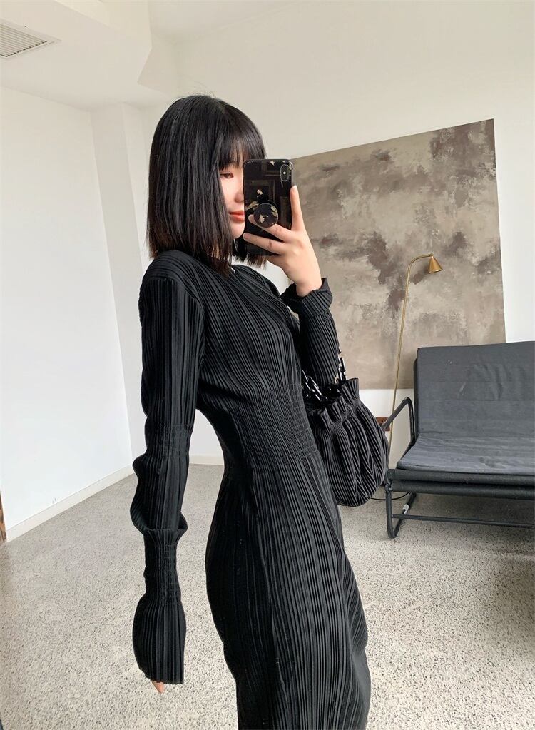 秋 プリーツ ドレス ワンピース ロングスカート プリーツスカート ワンピドレス ロング丈 袖あり 長袖 ラウンドネック 襟なし スリム タイプA プリーツ ふわふわ 透け感 ポリエステル 異素材MIX きれいめ シンプル 大人 上品 おしゃれ レトロ 大人女子 こなれ感 モード系 モダン 無地 秋 30代 レディース 女性用 ママ 女の子 オフィス ビジネス OL 通勤 学生 通学 女子会 休日 イベント リゾート ホテル レストラン 着回し ファッション 暖かい インスタ映え ワンサイズ ブラック
