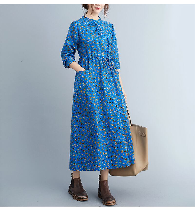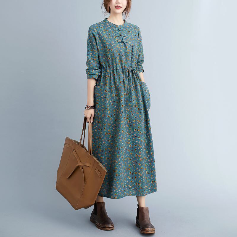 ワンピース レディース フレアワンピース ロング丈 袖あり 長袖 スタンドカラー フレア Aライン ギャザー ウエストリボン ポケット 花柄 かわいい 大人可愛い カジュアル おしゃれ お洒落レトロ アジアン ラフ ルーズ M L XL 2XL 3XL 大きいサイズ 大きめ ゆる ゆったり ブルー 青 ネイビー 紺 茶色 ブラウン イエロー 黄色 レッド 赤 花柄 フラワー 春 秋 20代 30代 40代 50代 ママ マタニティ お出かけ 女子会 休日 イベント 旅行 普段使い 体型カバー 楽ちん