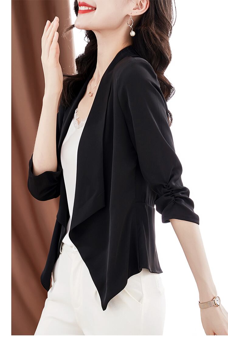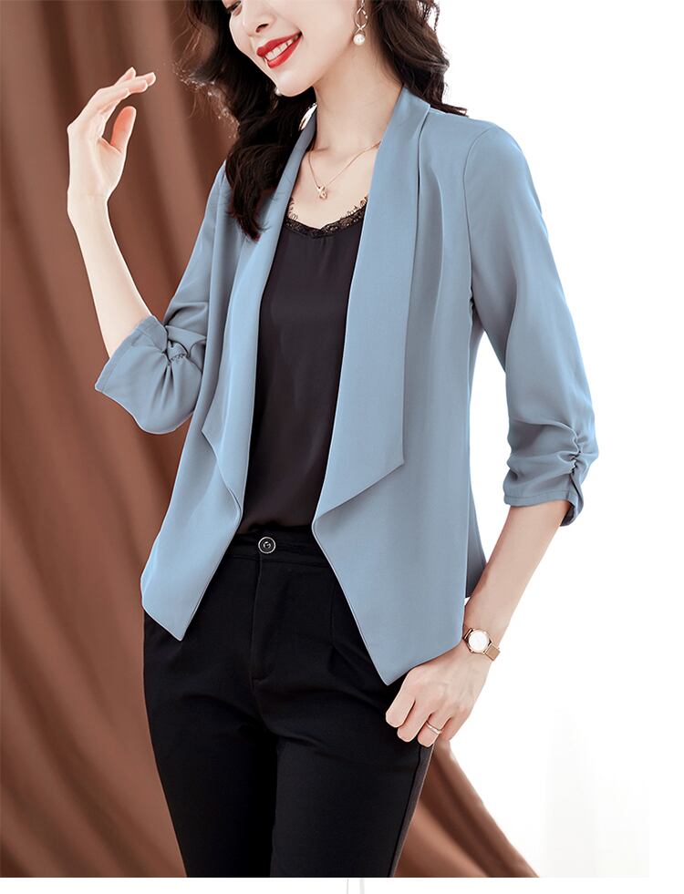 3色カラバリ薄手のノーボタン7分袖ジャケット。